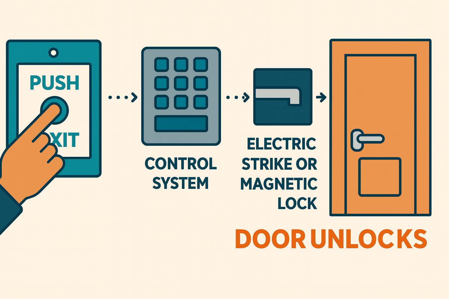 Push exit buttons require the user to physically press a button to release the door lock. The access control system operates a push-to-exit button connected to the door’s electric locking mechanism.